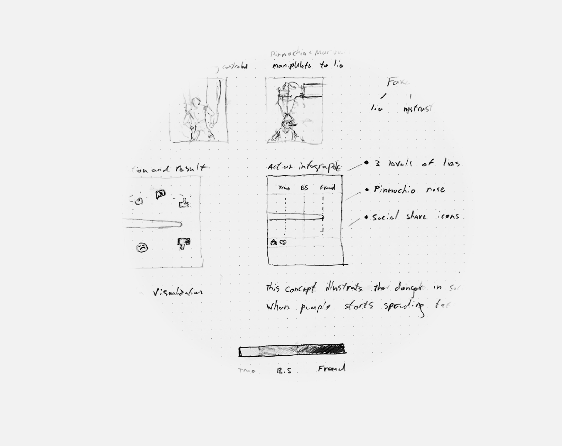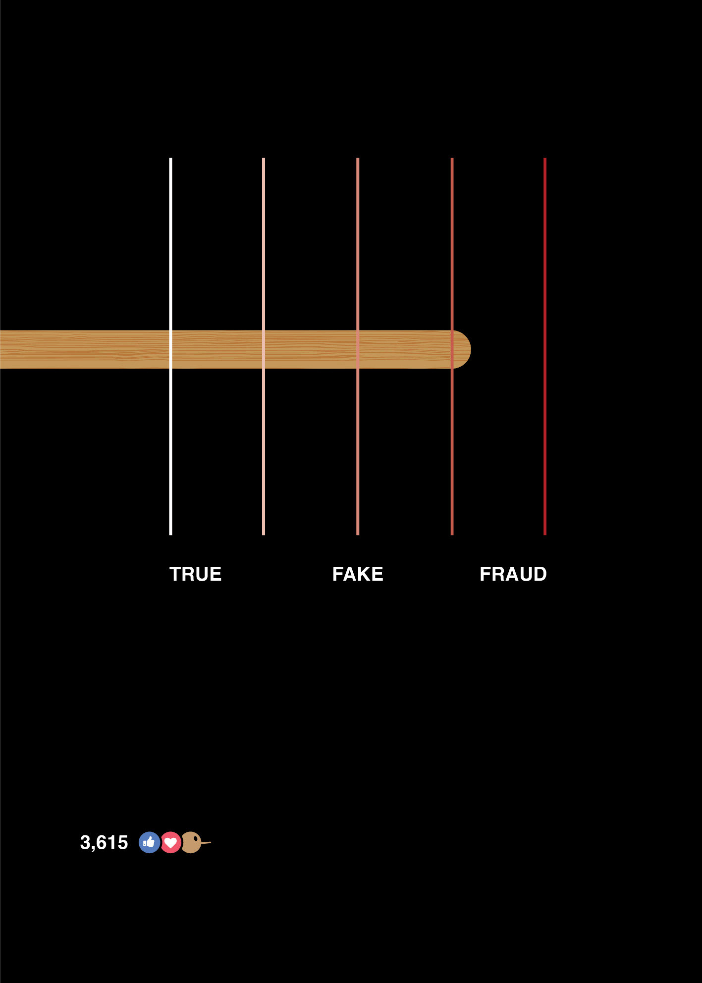 I chose to design a poster for the fake news competition. The brief requires designing a poster that increases awareness for fake news damage. My designed concept is transformation. People can transform the truth into fake or even to fraud; the intention determines it. I decided to communicate the idea through the tale of Pinocchio. In the story, when Pinocchio lies, his nose extends. In contrast, when Pinocchio tells the truth, his nose shortens. The nose width is the index of the truth. I used semiotics to communicate the message. I designed the poster with four elements: A wood-stick icon and index, text and lines symbols, and social media symbols. Each one of the parts adds information to complete the story. Next, I used an analogy to decrease the design entropy and make it obvious. My chosen analogy is Pinocchio's nose. In the story, when Pinocchio lies, his nose extends. In contrast, when Pinocchio tells the truth, his nose shortens. This fact is also actual for fake news spread. The more people spread fake news, the more damage it causes. Similarly, the more damage it causes, the harder the consequences.